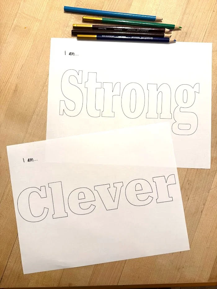 Use colored pencils or crayons to decorate! Stickers and other craft materials are fun too. The idea is that kids will hang this somewhere in their home and they will be reminded each time they see the word that they are indeed… STRONG!