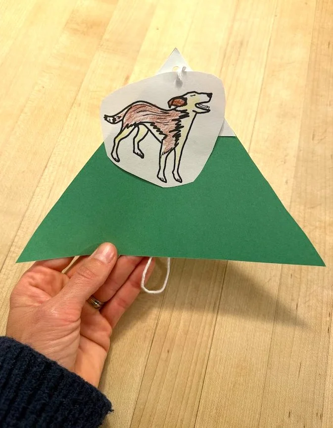 Tie one end of the sting to Nina. Then thread the other end of the string through the mountain top hole. Tape the string to the bottom/back of the mountain.