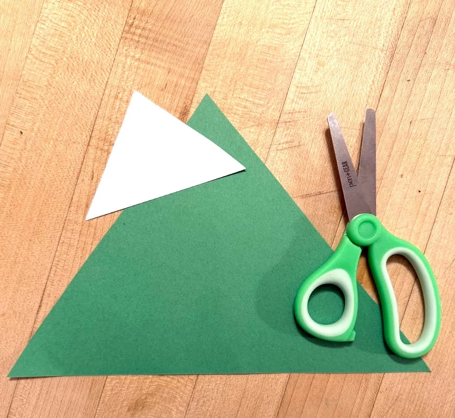 Using the scissors, cut a large triangle from one piece of paper and a smaller triangle from the other paper to make the mountain top.